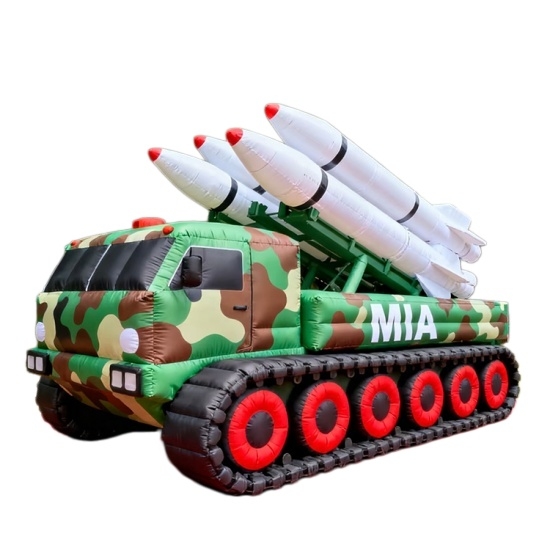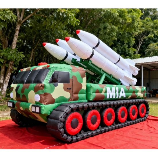detailed product descriptionA military-style inflatable vehicle with camouflage paint, red-tracked wheels, and four white missiles (red tips). Marked “MIA” on the side, it’s perfect for themed events, exhibitions, or training simulations. Durable PVC material ensures long-lasting use; easy inflation/deflation for portability.