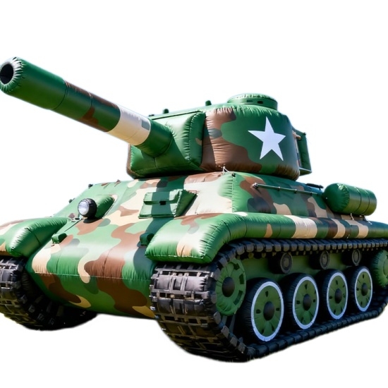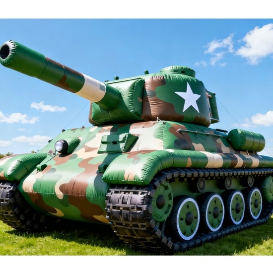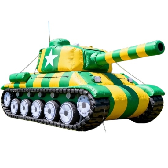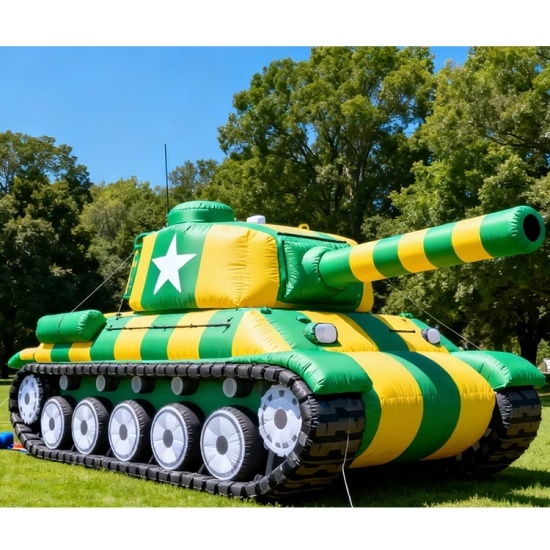 A vibrant inflatable tank with green-yellow stripes, white star emblem, and detailed treads. Perfect for kids’ parties, carnivals, or themed festivals. Lightweight, easy to inflate, and visually striking—adds a playful, tactical touch to any event.