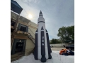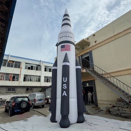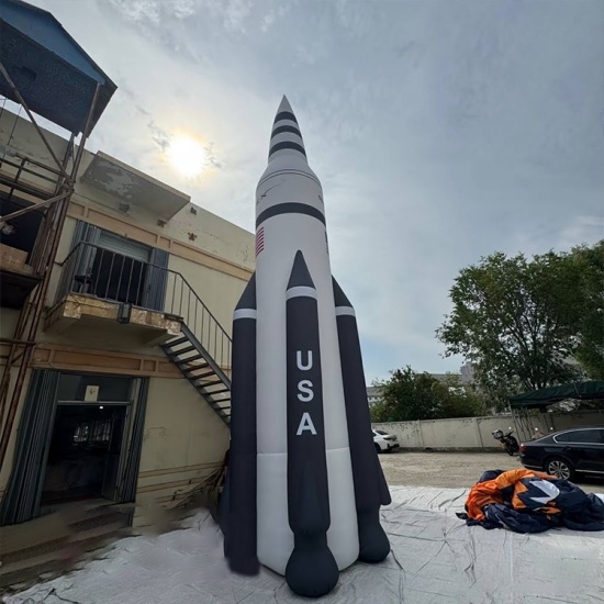 The large inflatable rocket is designed for event decoration, festivals, and promotional campaigns. Constructed from durable PVC, it features a vibrant orange-and-white color scheme with space-inspired detailing. It supports rapid inflation and is suitable for brand activations, airshows, and themed parties, offering high audience engagement.